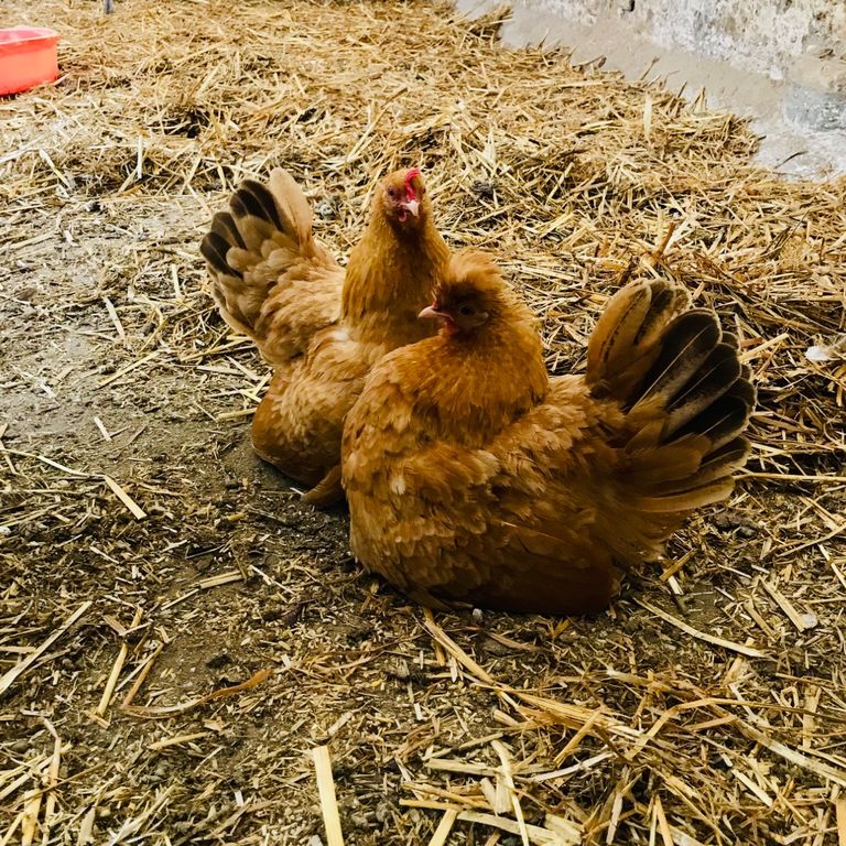 Die Hühner sind zutraulich und werden gern aus der Hand gefüttert, während sie den Hof erkunden.