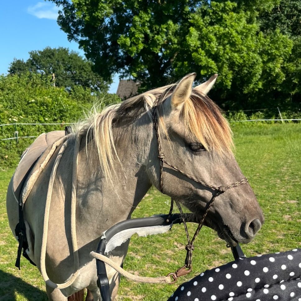 Unsere aufgeschlossene Mathilda, die junge Konikstute, ist auf dem Hof das Herdenküken. Sie erinnert durch ihre Fellfarbe und die besonderen Strähnen in ihrer Mähne (immer noch) an ein Wildpferd. Auch ihr natürlicher, robuster und selbstsicherer Charakter mit unendlich viel Freundlichkeit, macht sie zu einem ganz sympathischen Pferdchen und erobert so in kurzer Zeit die Kinderherzen.